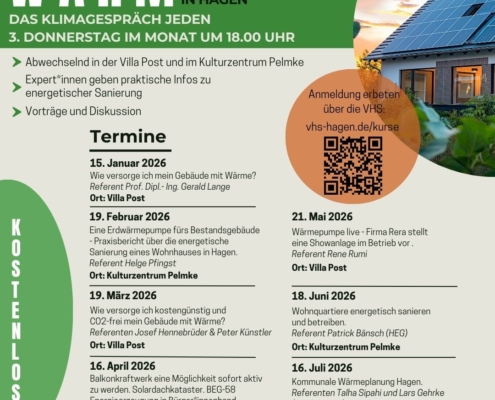 Uncategorized„Nachhaltig warm – zukünftige Wärmeversorgung in Hagen“ unter diesem Motto findet jeden 3. Donnerstag im Monat eine Veranstaltung zur Wärmeversorgung statt. Abwechselnd in der VHS und im Kulturzentrum Pelmke in Wehringhausen informieren…