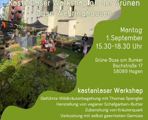 Am Montag, 1. September von 15:30–18:30 Uhr laden wir euch herzlich zum kostenlosen Workshop in der Grünen Oase Wehringhausen (Bachstraße 17, Hagen) ein.