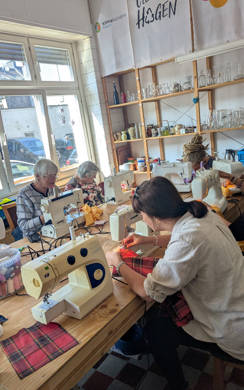 В этой яркой межкультурной швейной группе появляются сумки, подушки, предметы одежды и различные креативные изделия для мероприятий в районе — и всё это из использованных материалов. Здесь не только шьют, но и изучают немецкий язык, смеются и вместе пьют кофе.