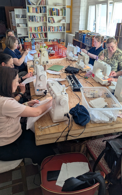 Неважно, есть ли у вас опыт шитья или вы только хотите попробовать — рады каждому! Приносите свои идеи, остатки тканей или просто хорошее настроение. Швейные машинки у нас есть на месте. В настоящее время мы всё ещё ищем дополнительные швейные машинки — будем рады пожертвованиям!