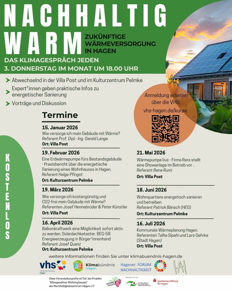 „Nachhaltig warm – zukünftige Wärmeversorgung in Hagen“ unter diesem Motto findet jeden 3. Donnerstag im Monat eine Veranstaltung zur Wärmeversorgung statt. Abwechselnd in der VHS und im Kulturzentrum Pelmke in Wehringhausen informieren Fachreferent:innen und Bürger:innen über Möglichkeiten seine Gebäude nach neuesten Kriterien anzupassen.