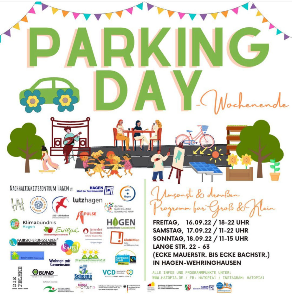 Seit 2022 organisiert Hatopia bzw. Nachhaltigkeitszentrum Hagen e.V. jedes Jahr am dritten Septemberwochenende den Parking Day in Hagen. Dabei verwandeln sich gewöhnliche Parkplätze für einen Tag in Orte der Begegnung, Kreativität und Nachhaltigkeit.