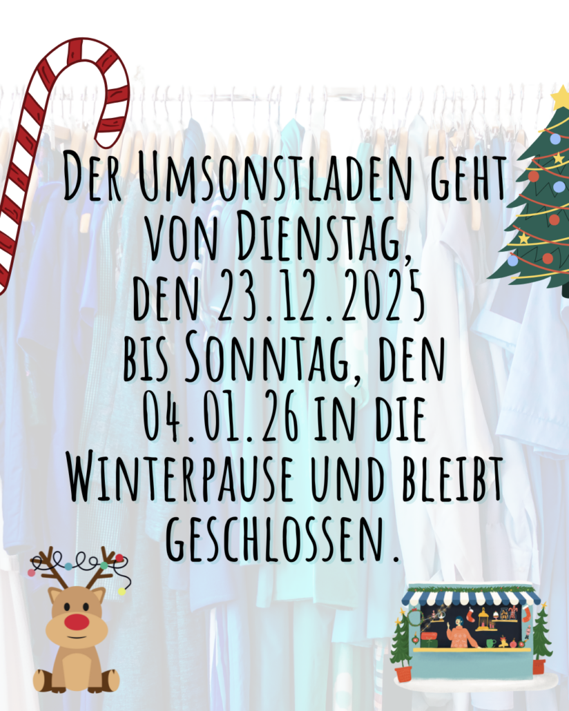 Der Umsonstladen geht in die Winterpause und bleibt von Dienstag, den 23.12.2025 bis Sonntag, den 04.01.2026 geschlossen.